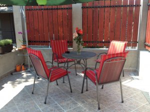 A telek adottsága miatt lényegében egy szintnyi különbség van az eleje és a hátulja között, ami miatt egy lépcsősor került kialakításra a szint különbség áthidalására. Az utcafronti részen található nevezzük terasznak (a ház felső szintjével van egy szinten), itt már tavaly megtörtént a járólapozás, ekkor a lépcső is megkapta a burkolatát.