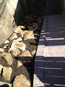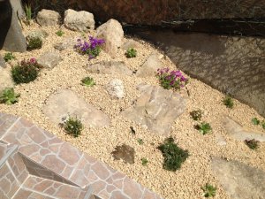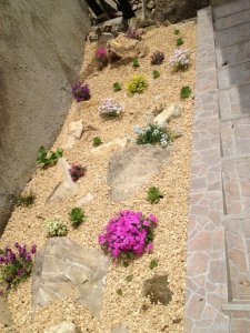 Friss kicsit agyagos földdel előkészítettük a terepet, kialakítottuk a szinteket és lejtőket. Erre került a geotextília, megelőzve a gyom feltörését. Némi föld rá és elkezdtük behordani a sziklákat, ami nem is volt egyszerű feladat, hiszen egyik másik tetemes méretű és súlyú volt, továbbá nehezítette a lépcsőzés is a munkát, de végül csak bekerültek a helyükre a kisebb-nagyobb darabok. Nagyon alaposan be tömködtem minden lukat és rést földdel és természetesen a sziklákra is került föld. Fontos, hogy a sziklák jelentős része kerüljön a föld alá, megelőzve a későbbi elmozdulást. Ezek garantáltan nem mozdulnak ki, többszöri “sziklamászással” kipróbáltam. Tetejére került még jó minőségű virágföld is, hogy kedvezzek a beültetésre kerülő virágoknak. Ezzel elkészült az első fázis, így pihent pár napot, közben rendszeresen locsolgattam, hogy minél jobban tömörödjön a föld.