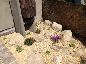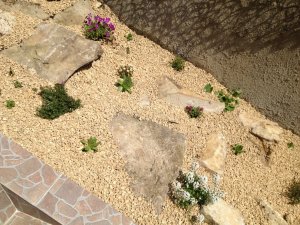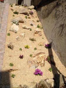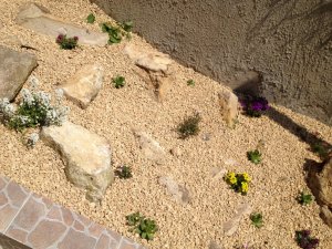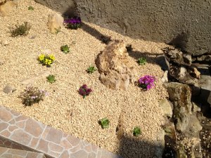 Szépen elrendeztem a virágokat, megnéztem az összképet, kicsit változtattam és hatalmas lendülettel neki álltam életet lehelni a sziklakertbe. Miután minden virágot sikerült a végleges helyére ültetni jöhetett a nem kevésbé fáradságos zúzott kővel való terítés. Igyekeztem a sziklák színéhez hasonló zúzott követ venni, ez a természetesebb hatás kedvéért fontos.